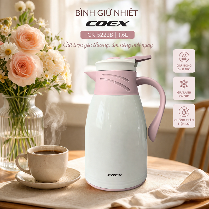 Bình giữ nhiệt Coex 1.6L CK-5222B là giải pháp lý tưởng cho gia đình, văn phòng hay nhu cầu mang theo nước nóng/lạnh trong ngày. Với thiết kế hiện đại, dung tích lớn cùng khả năng giữ nhiệt ấn tượng, sản phẩm giúp bạn luôn sẵn sàng cho mọi nhu cầu sử dụng.