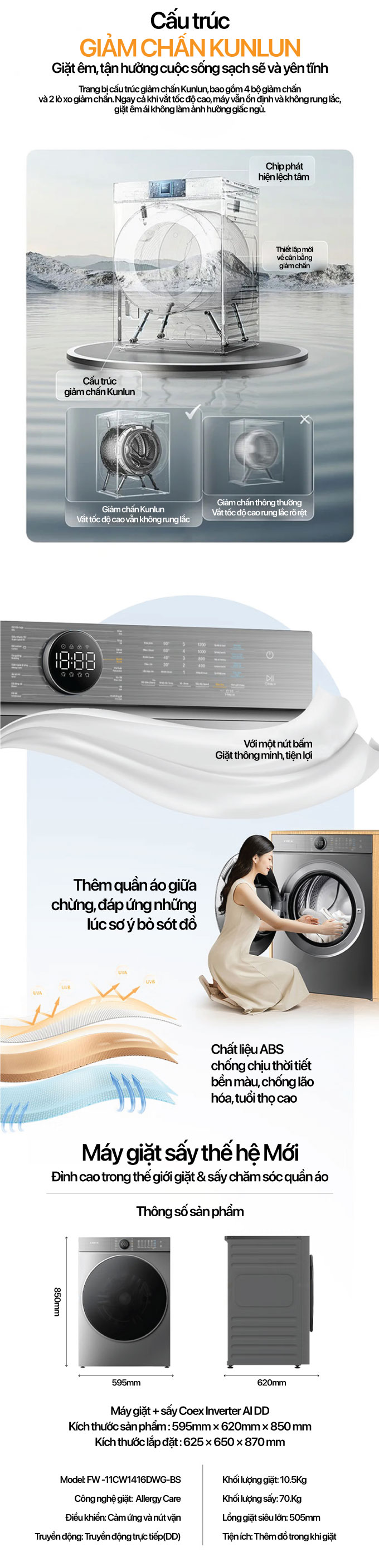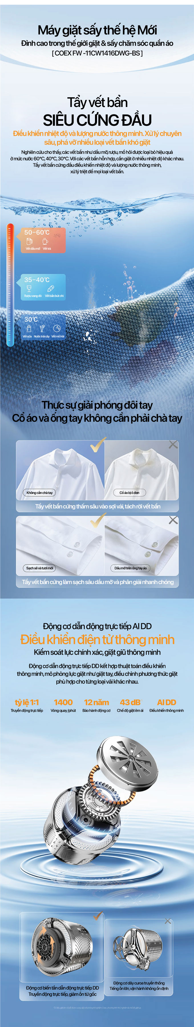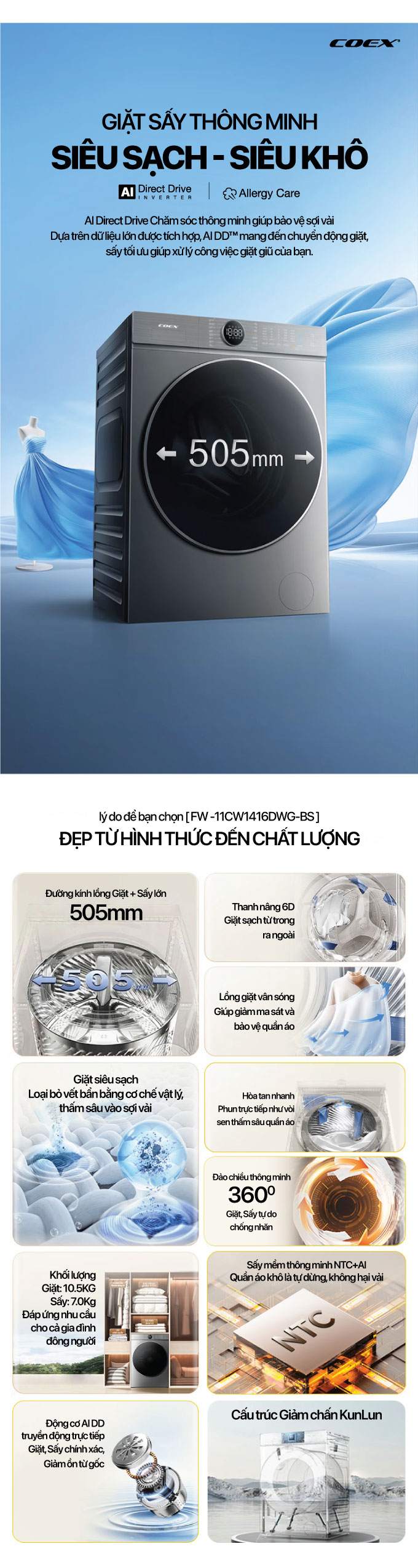 Máy giặt sấy lồng ngang INVERTER 10.5kg COEX FW -11CW1416DWG-BS được trang bị công nghệ AI DD Inverter giúp chiếc máy giặt này vận hành ổn định, tiết kiệm năng lượng, hoạt động êm ái một cách tối ưu nhất.