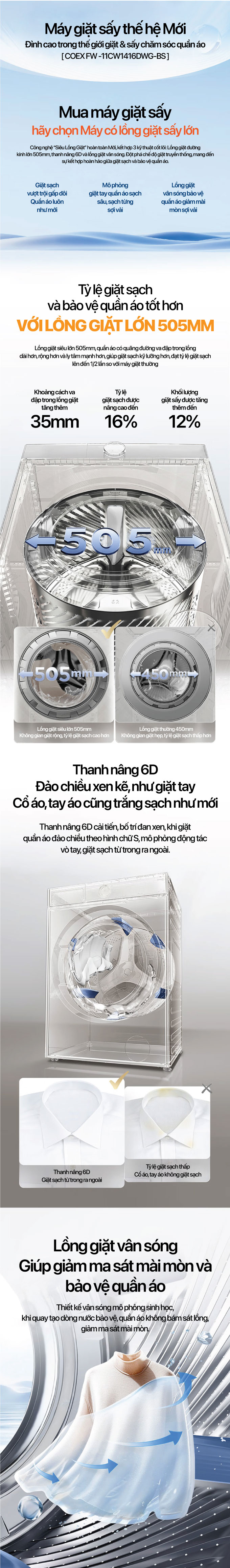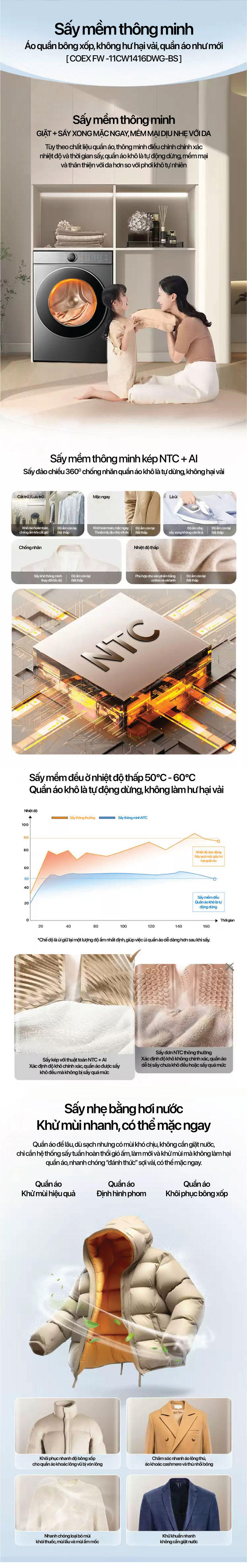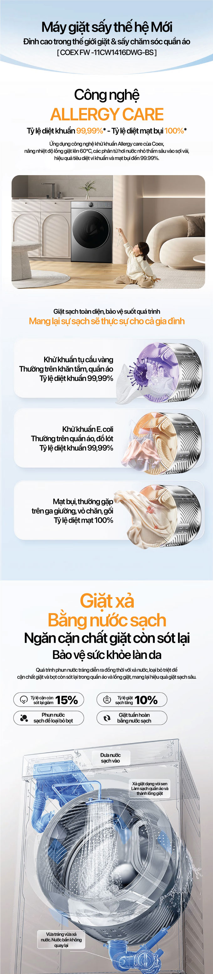 Tóm lại, máy giặt sấy lồng ngang Coex FW -11CW1416DWG-BS là lựa chọn phù hợp cho những hộ gia đình trên 7 thành viên, với công nghệ giặt hơi nước Steam, công nghệ kháng khuẩn Ozone, chương trình giặt thông minh M-Smart... Đây chắc chắn sẽ là một người bạn đồng hành không thể thiếu cho các gia đình.