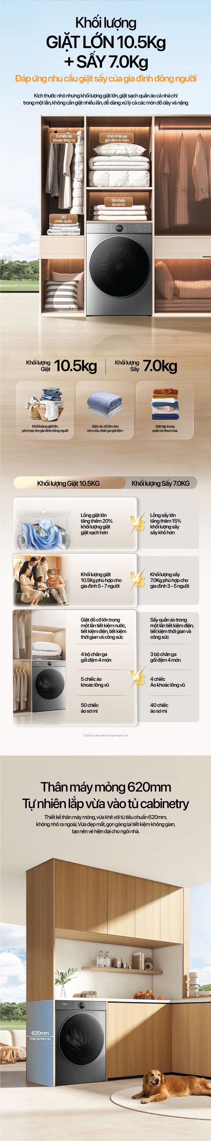 Chiếc máy giặt sấy Coex Inverter này phù hợp cho nhu cầu giặt giũ của các hộ gia đình từ trên 7 người nhờ có khối lượng giặt 10,5 kg và sấy 7 kg.